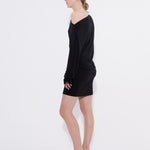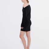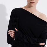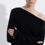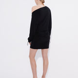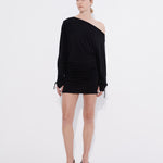 Effortlessly modern, this black mini dress features a fluid off-shoulder neckline and soft ruching through the waist for a flattering, sculpted fit. The relaxed long sleeves with subtle drawstring details balance the body-skimming silhouette