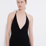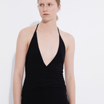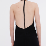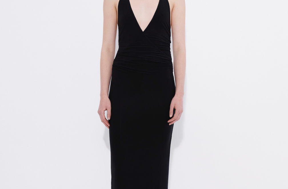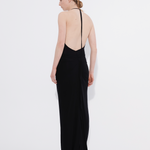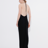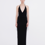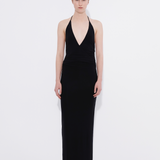 A timeless silhouette with a modern edge, this black maxi dress features a deep V neckline and plunging open back with an elongated self-tie strap that drapes down the spine. Adjustable tie allows for a custom fit. Cut for a sleek, fluid drape that flatters the form.