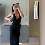 A timeless silhouette with a modern edge, this black maxi dress features a deep V neckline and plunging open back with an elongated self-tie strap that drapes down the spine. Featuring an adjustable tie allowing for a custom fit.