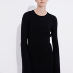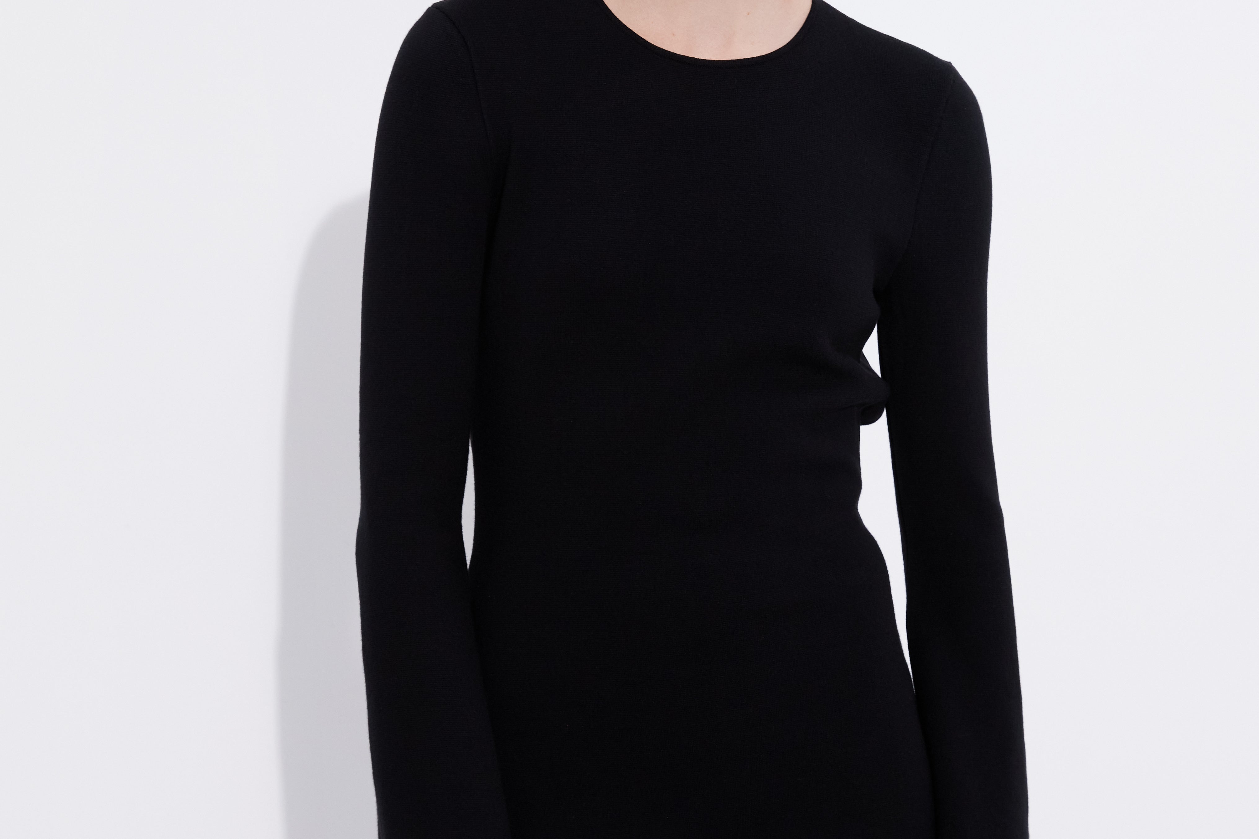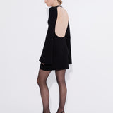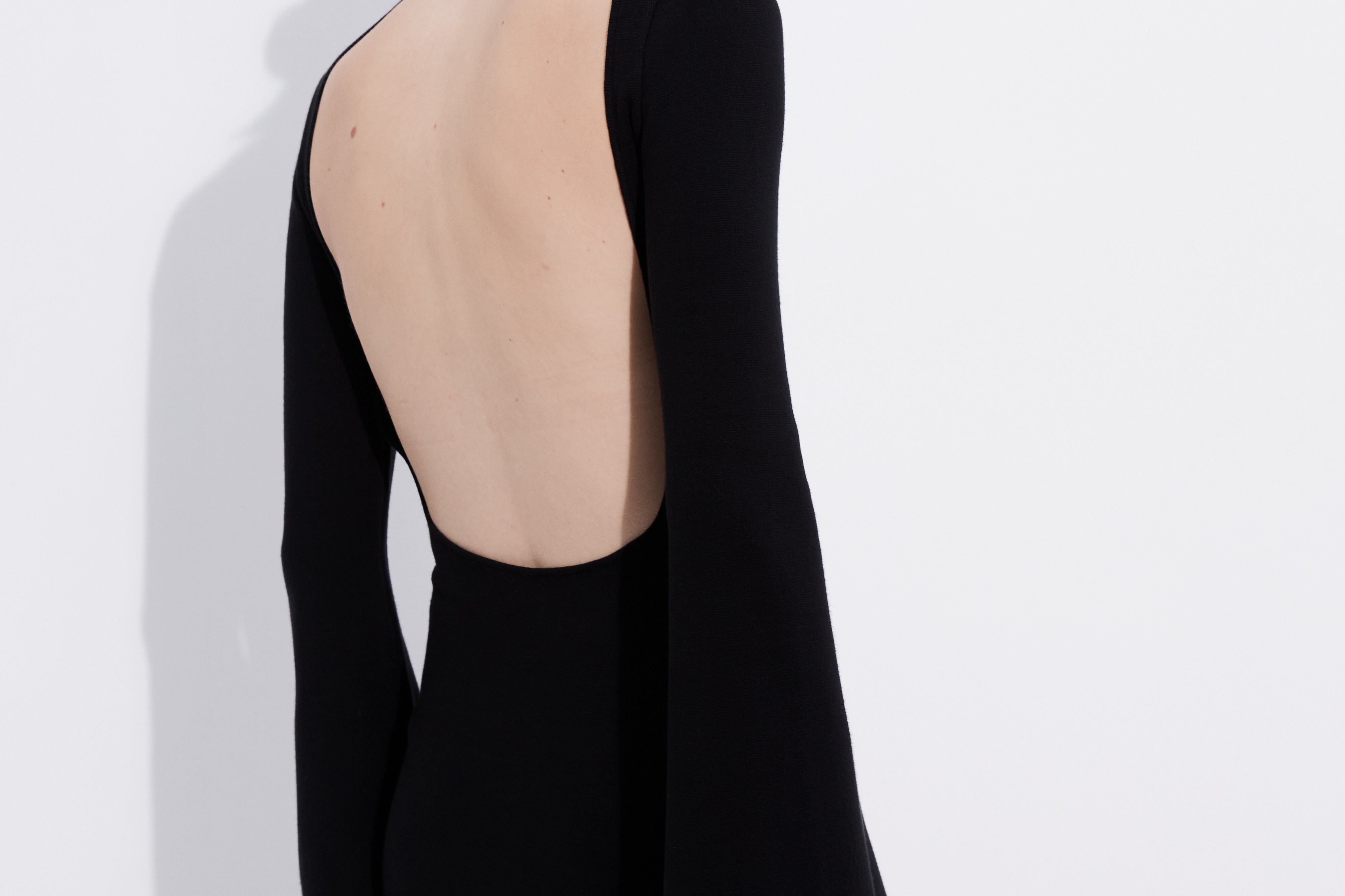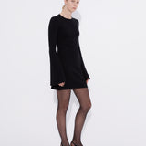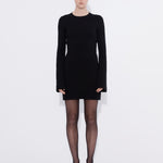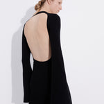 Sleek and sculptural, this long-sleeve mini dress features an open back balanced by a clean crew neckline and flared sleeves. Crafted from a stretch knit that flatters the silhouette