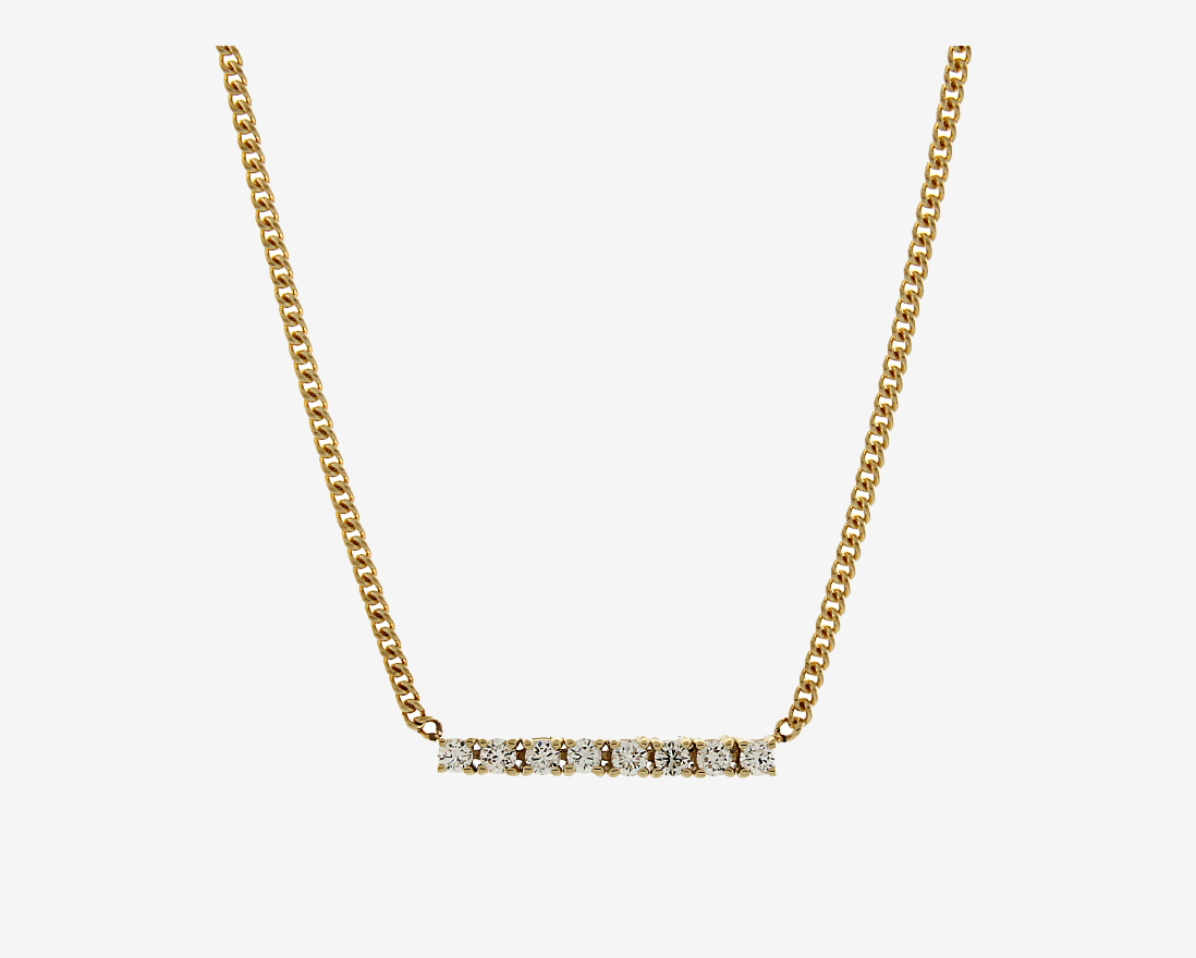 Crafted in Sterling Silver with 14k gold plate and set with radiant lab-grown diamonds, this piece offers timeless elegance with a modern, sustainable edge. The clean bar silhouette highlights the brilliance of each stone, creating a refined everyday necklace that layers beautifully or shines on its own.