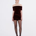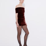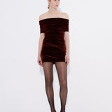 A luxurious velvet mini dress designed with an off-shoulder neckline and ruched detailing for a flattering fit, itÕs the perfect party dress in a deep burgundy.