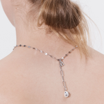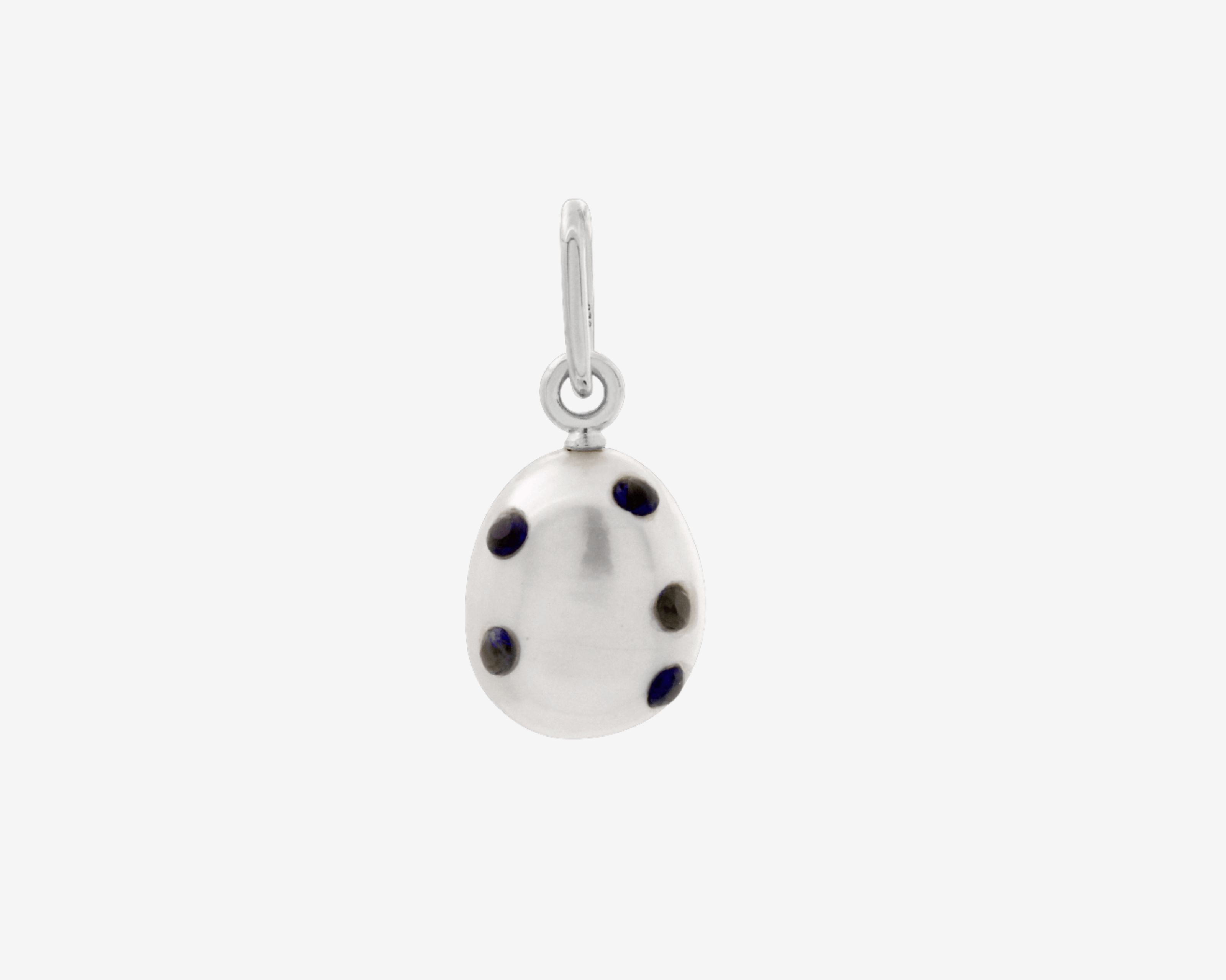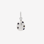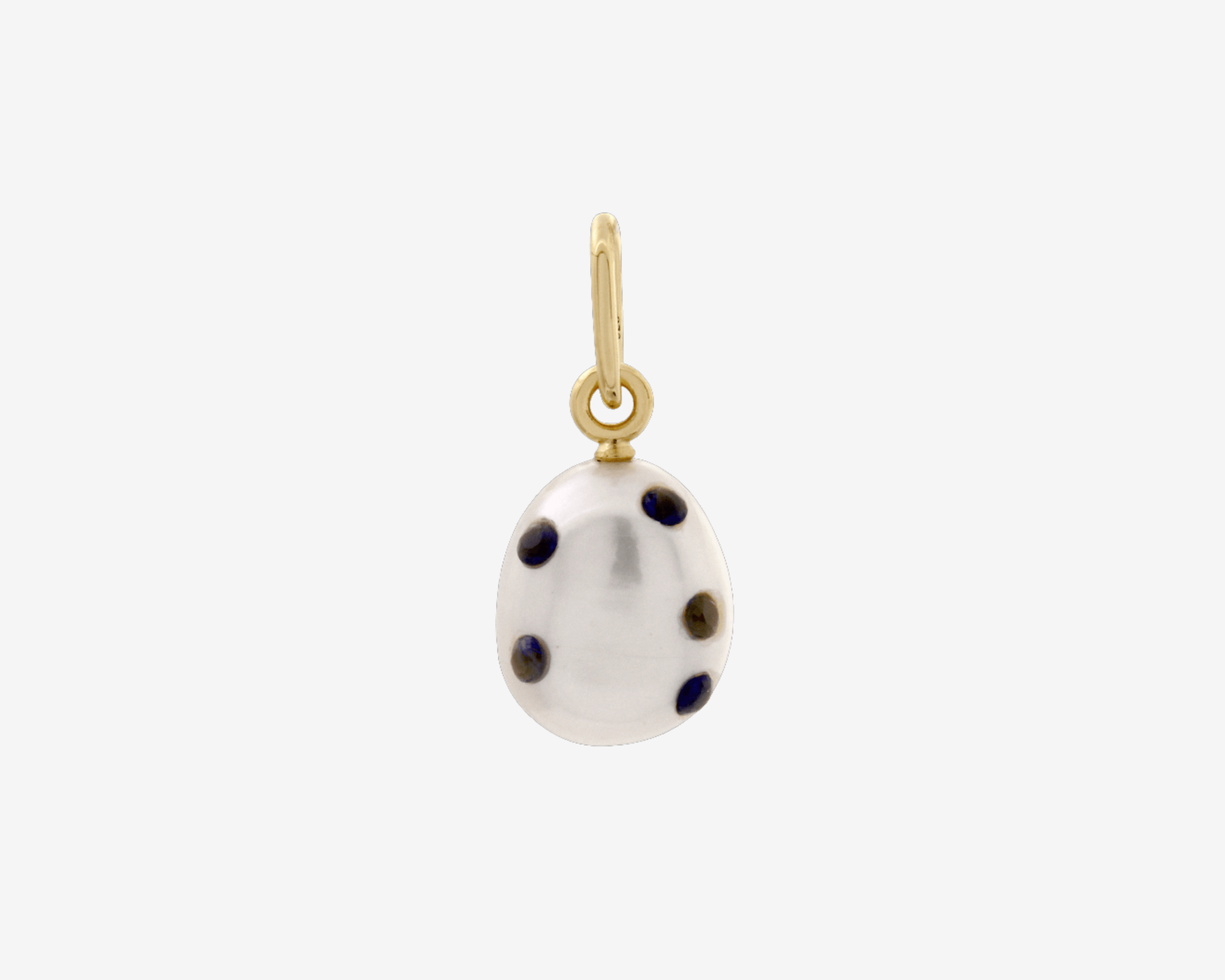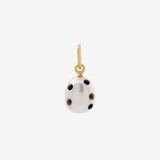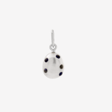 A playful sterling silver pearl charm featuring a smooth white pearl accented with scattered blue gemstones for a modern look. Available in 14ct gold or rhodium plating and compatible with the Sener Besim buildable collection, it adds a unique touch to any chain or bracelet.