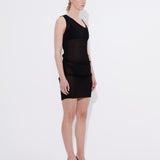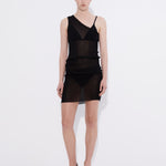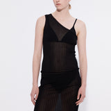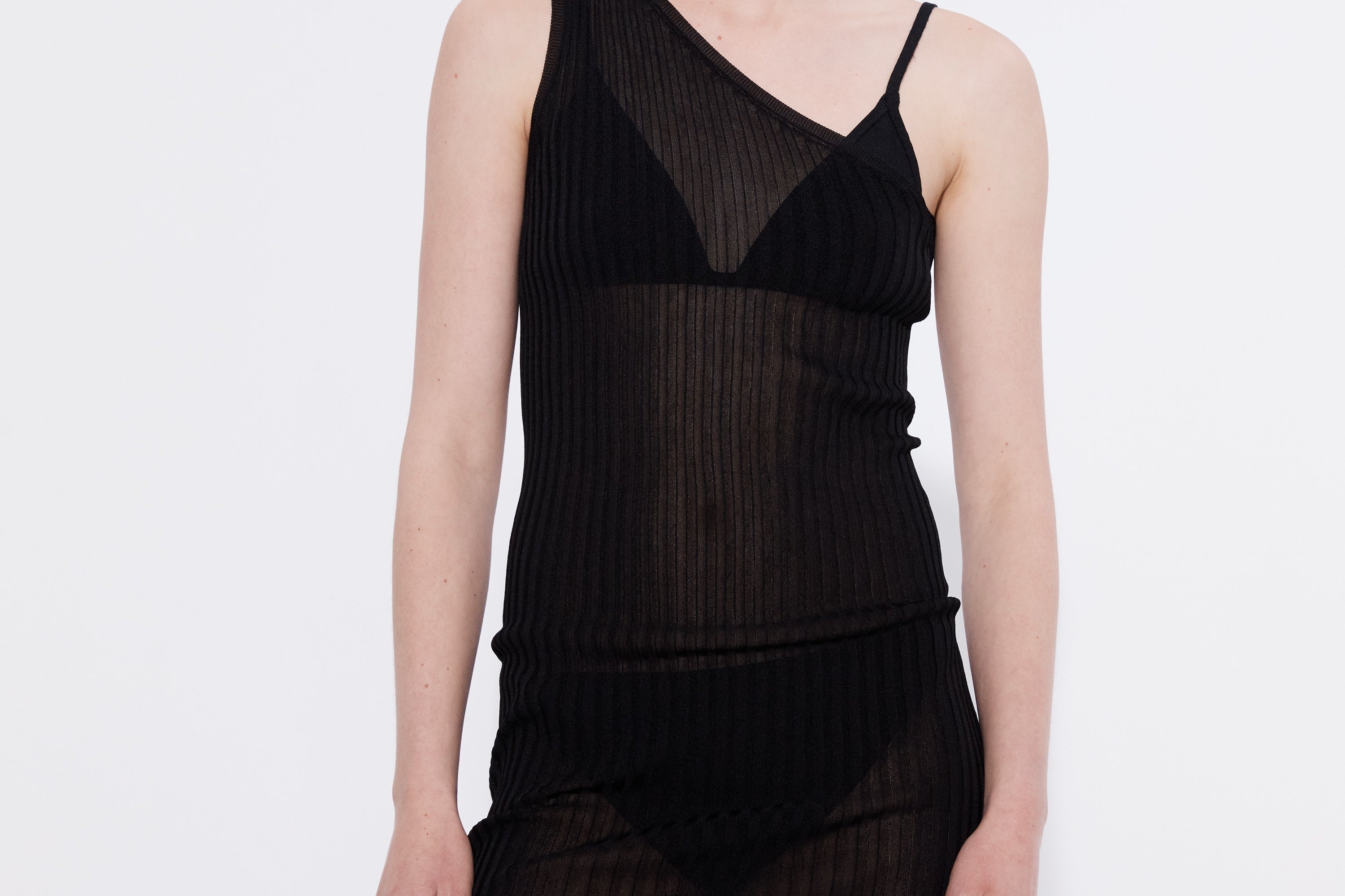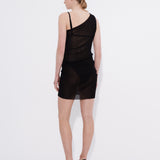 A lightweight sheer knit mini dress featuring an asymmetric neckline and soft ribbed texture. Designed for layering, this piece adds a modern, effortless edge to any look
